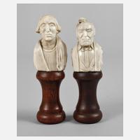 20. Jh., Hirschhorn beschnitzt, vollplastisch als Büsten gearbeitete Portraits der berühmten US-amerikanischen Präsidenten George Washington und Abraham Lincoln, auf gedrechselten gebeizten Holzsockeln montiert, H je ca. 13 cm.
