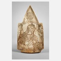 Volkskunst, 19. Jh., Beinplatte mit Spitzbogenabschluss und Rosette, gravierte und geschwärzte Darstellung, Zentralmotiv "Das unbefleckte Herz Mariä" flankiert von zwei fabelähnlichen Gestalten, teils ornamental gefasst, trocknungsrissig, Altersspuren, Maße 24 x 14 cm.