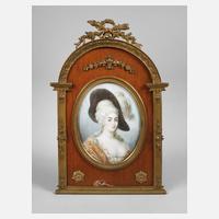 um 1900, undeutlich signiert I. Bause, Gouache auf Platte, feines Rokokofräulein im tief dekolettierten Kleid mit federgeschmücktem Hut, vor hellblauem Fond, hinter Glas im Oval gefasst, der umschließende Holzrahmen aufwendig verziert von vergoldeten Messingzierteilen in Architekturoptik und bekrönt von Schleifenband, rückseitig mit Aufsteller, Maße 14 x 21 cm.