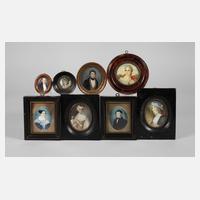 19./20. Jh., acht Stück, teils signiert, Gouache auf Platte, Halbfigurenbildnisse eines Biedermeierpaars, zweier feiner Herren derselben Epoche sowie vier Darstellungen junger Damen des Barocks bzw. des Rokokos, alle hinter Glas gefasst, unterschiedliche Maße und Erhaltung, Maße max. 16 x 11 cm.