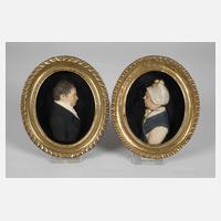 1. Hälfte 19. Jh., Wachs gegossen, farbig staffiert, Portraitpendants eines Paares mittleren Alters im Profil, vor monochromem Fond, Herr im Gehrock mit hochgeschlossenem Hemdkragen, die Ehefrau mit Haube und Schultertuch, jeweils hinter Glas in schmale Messingleiste gefasst, teils alt repariert, Altersspuren, H je ca. 14 cm.