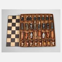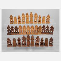 Mitte 20. Jh., Holz geschnitzt, farbig gefasst, teils gold- bzw. silberbronziert, leicht abstrahierte figürliche Spielfiguren, komplett, im originalen Karton, mit papierener Spielfläche, leichte Altersspuren, H König 7,5 cm.