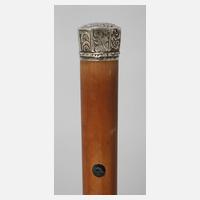 um 1910, ungemarkt, abgekantetes Griffstück aus versilbertem Metall mit reliefiertem Schwertliliendekor und unleserlicher Kartusche, Schuss aus Schlangenholz, gummiverstärkte Eisenzwinge, Altersspuren, H 85 cm.