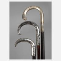 um 1900, alle gemarkt 800, gebogte Griffstücke in floralem und ornamentalem Reliefdekor, einer mit graviertem Besitzermonogramm JP, alle mit Hartholzschuss, Gummi- bzw. Nickelzwinge, einer ohne, Alters- und Gebrauchsspuren, L max. 92 cm.