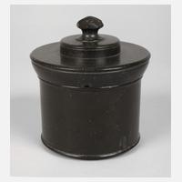 19. Jh., aus dunkelbraunem, leicht geädertem Zöblitzer Granatserpentin gefertigte Deckeldose mit schlichter zylindrischer Wandung und aufgelegtem Flachdeckel mit facettiertem Knauf, Deckelrand mit Chip, sonst gute originale Erhaltung, H 13 cm.