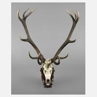 kapitaler 14-Ender mit starken Stangen, auf mit Eichenlaub verzierter Holzplatte montiert, Schädelplatte mit "Lonya, Ungarn 14.9.1967" beschriftet, dazu Abschussdiplom der Ungarischen Landes-Preisrichterkommission für Jagdtrophäen, guter Zustand, B 100 cm, H 135 cm.