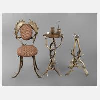 Anfang 20. Jh., bestehend aus Stuhl, Standascher und Rauchtisch, aus Rot- und Dammwildschaufeln gestaltete Kleinmöbel, der Stuhl mit gepolsterter Sitzfläche und Lehne, der Ascher mit Neusilbermontierung, der Tisch mit polygonal facettierter Rüsterplatte, fragmentarisch erhaltene Zigarrenschneider, Zigaretten- und Streichholzhalter, unterschiedliche Maße und Erhaltungen, H max. 100 cm.