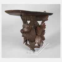 Brienz, Ende 19. Jh., Nussbaum beschnitzt und dunkel gefasst, passig geschweiftes kleines Wandboard mit plastisch gearbeitetem Gamskopf, dieser mit eingesetzten Glasaugen, gerahmt von Blattwerk, kleinere Fehlstellen, Maße 18 x 20 x 14 cm.