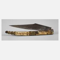 19. Jh., Schmiedeeisen, Messing und Horn, klappbare Klinge, das Griffstück floral graviert, Alters- und Gebrauchsspuren, L max. 40,5 cm.