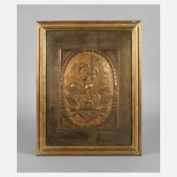 19. Jh., Messingblech getrieben, teils fein ziseliert und vergoldet, hochrechteckige Darstellung mit ovalem Medaillon, gerahmt von Lorbeerlaub, zentral platzierter Jägersmann mit Flinte über volutengeschmückter Wappentafel mit springendem Hund und Adler, flankiert von Rankwerk, berieben, Altersspuren, in vergoldeter Leiste gefasst, Maße 51 x 41 cm.