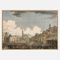 der von Menschen gefüllte Römer in Frankfurt am Main, beim Einzug von Kaiser Leopold II am 30. September 1790, im Zentrum des Geschehens die Alte Nikolaikirche, kolorierter Kupferstich, Ende 18. Jh., unten rechts in der Platte signiert "Abel sc.", leicht gebräunt, unter Passepartout und hinter Glas gerahmt, Darstellungsmaße ohne Schrift ca. 33,5 x 46,5 cm. Künstlerinfo: eigentl. Gottlieb Friedrich Abel, dt. Maler und Kupferstecher (1763 oder 1768 Stuttgart bis nach 1808), Schüler von Johann Gotthard von Müller, Angestellter am württembergischen Hof in Stuttgart, bekannt als Illustrator botanischer Werke, Quelle: Thieme-Becker und Wikipedia.