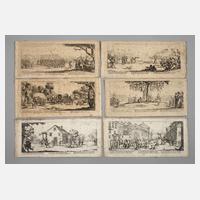 sechs Blatt der 18 Radierungen umfassenden Folge "Les Grandes Misères de la guerre", jeweils unter der Darstellung Text und in der Platte bezeichnet "Jac. Callot fecit" und "Israel exc. 1633", unterschiedliche Erhaltung, Darstellungsgröße ohne Schrift je ca. 7,3 x 18,2 cm, Blattmaße ca. 9,6 x 20,3 cm. Künstlerinfo: bedeutender lothringischer Zeichner und Grafiker (1592 Nancy bis 1635 Nancy), ab 1607 kurzzeitige Lehre als Goldschmied, 1608-12 Aufenthalt in Rom und Lehre bei dem Kupferstecher Philippe Thomassin, anschließend trat er in Florenz in die Werkstatt von Antonio Tempestas ein, ab 1614 in erster Linie für Cosimo II. de´ Medici tätig, nach dessen Tod Rückkehr nach Nancy, Aufgrund finanzieller Schwierigkeiten Unterstützung durch Herzog Heinrich II. von Lothringen, gegen Ende der 1620er Jahre Reisen nach Paris und in die Niederlande, hier erhielt er zahlreiche Aufträge von verschiedenen Höfen, durch Anregung seiner Erlebnisse im Dreißigjährigen Krieg entstand die Folge "Les miséres de la guerre" (Die Gräuel des Krieges), Quelle: Thieme-Becker und Wikipedia.