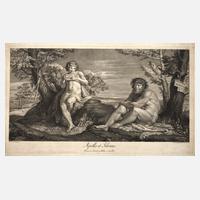 der sitzende Silen, misstrauisch dem Panflöte spielenden Gott des Frühlings und der Künste Apollo lauschend, bei einer Baumgruppe in offener Landschaft angesiedelte Szenerie, nach einem Gemälde von Annibale Carracci, unterhalb der Darstellung im Druck betitelt und bezeichnet "Apollo et Silenus/Roma ex Tabula in Adibus Lancellotti", erschienen in "Schola Italica Picturae", in den unteren Ecken bezeichnet "Hann. Caracci pinxit" und „Dom. Cunego sculpsit Roma 1770", braunfleckig, Darstellungsmaße ohne Schrift ca. 20,5 x 38,5 cm, Blattmaße ca. 26 x 42 cm. Künstlerinfo: italienischer Graphiker (1727 Verona bis 1803 Rom), Lehre bei Francesco Ferrari, ab 1760 in Rom ansässig, 1785-89 in Berlin tätig, ab 1793 mehrere Stiche nach den Deckengemälden der Sixtinischen Kapelle, stach nach zahlreichen italienischen und auch britischen Künstlern, Quelle: Thieme-Becker und Wikipedia.