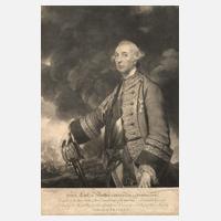 der souverän den Betrachter anblickende General vor Schlachtenszene, unterhalb der Darstellung Informationen zum Dargestellten, nuancenreiches Schabkunstblatt nach einem Gemälde von Joshua Reynolds, Mitte 18. Jh., unter der Darstellung in der Platte bezeichnet rechts "J. MacArdell fecit." und links "J. Reynolds pinx.", Blatt gleichmäßig gebräunt und etwas knitterspurig, hinter Glas gerahmt, Darstellungsmaße ohne Schrift ca. 43,5 x 34,5 cm. Künstlerinfo: irischer Graphiker (um 1729 Dublin bis 1765), Schüler von John Brooks, ging mit seinem Lehrer 1746 nach London und Eröffnung einer Druckerei, er fertigte 35 Schabkunstblätter nach Joshua Reynolds, Quelle: Thieme-Becker und Wikipedia.