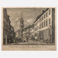Blick entlang der Klosterstraße mit Passanten und Pferdefuhrwerken auf den Turm der Parochialkirche, unterhalb der Darstellung in der Platte ausführlich betitelt, Radierung, um 1780, wohl späterer Abzug, unter der Darstellung bezeichnet links "dessiné et gravé par Jean Rosenberg", mittig geglättete Faltlinie, gleichmäßig gebräunt und etwas fleckig, umlaufender Papierrand, hinter Glas gerahmt, Darstellungsmaße ohne Schrift ca. 45 x 61 cm, Blattmaße ca. 57,5 x 70 cm. Künstlerinfo: Johann Georg Rosenberg, auch Jean Rosenberg, dt. Maler und Graphiker (1739 Berlin bis 1808 Berlin), Schüler von Bernhard Rode und Carl Friedrich Fechhelm, 1764 zwecks Ausbildung Aufenthalt in den Niederlanden, ab 1765 Mitglied der Académie Royale in Paris, für verschiedene Theater tätig, Rückkehr nach Berlin und es entstanden zahlreiche großformatige Berlinansichten, 1785 Ernennung zum Ehrenmitglied der Preußischen Akademie der Künste, Quelle: Thieme-Becker und Wikipedia.