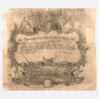 unausgefüllte Vorlage eines Gesellenbriefs (Handwerk) aus der Stadt Luzern mit ansprechender zeittypischer Rokokoverzierung, darunter Putten und Löwen und Merkur als Gott des Handels sowie unten eine angedeutete Vedute der Stadt, Kupferstich auf Bütten, unter dem Brieftext mit Datumsvorlage "17...", links unten in der Platte signiert und Ortsbezeichnung des Drucks "F. Xav. Schönbächler. sc. in. Einsidlen", Abzug wohl Mitte 18. Jh., auf Karton kaschiert mit Erhaltungsmängeln, hinter Glas gerahmt, Blattmaße ca. 55 x 49,5 cm. Künstlerinfo: Franz Xaver Schönbächler (1719 Einsiedeln bis ?), schweizerischer Kupferstecher, tätig vor allem in seiner Geburtsstadt, schuf vor allem Heiligenbilder, Titelblätter und Veduten (u.a. neun Ansichten von Einsiedeln), Quelle: Thieme-Becker.