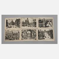 sechs Blatt mit der Darstellung verschiedener Bauten und Gebäudeensembles, teils mit Figurenstaffage, erfunden von de Vries und verlegt bei Philipp Galle in Antwerpen, Kupferstiche, um 1600, meist in der Platte bezeichnet "Vriese inv." und "Galle exud.", Blätter teilweise beschnitten, teils etwas fleckig, Darstellungsmaße ca. 16 x 21 cm, Blattmaße ca. 18 x 23,5 cm. Künstlerinfo: eigentl. Hans Vredeman de Vries, dt.-niederländischer Architekt und Maler (1527 Leeuwarden/Friesland bis 1604 Antwerpen), Lehre als Glasmaler, 1549 Mitarbeit an der Errichtung und Ausschmückung des Triumphbogens für Karl V. und Philipp II. in Antwerpen, in Mecheln Mitarbeiter von Dorizi, 1563/64 Übersiedlung nach Antwerpen, nachfolgend tätig in Aachen und Lüttich, 1575 Rückkehr nach Antwerpen, 1586-89 am Hof von Herzog Julius in Braunschweig, Ausmalung des Sommerratssaals im Rathaus von Danzig, bis 1596 am Hof von Kaiser Rudolf II. in Prag tätig, Quelle: Thieme-Becker und Deutsche Biographien.