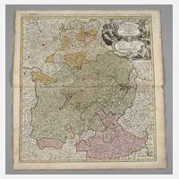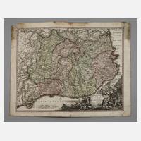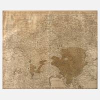 im oberen linken Bereich Kartusche und Legende, Darstellung des Gebiets zwischen Wunsiedel im Norden, Canischa (heute Nagykanizsa)/Ungarn im Osten, Parma und Adrie im Süden und Basel im Westen, teilkolorierter Kupferstich, im oberen Bereich datiert "...1788", mittig Faltlinie, gebräunt und Einrisse im Randbereich, unter Passepartout und hinter Glas gerahmt, Darstellungsmaße ca. 45 x 56 cm. Info Homanns Erben: Johann Baptist Homann (1664 Kambach bis 1724 Nürnberg, dt. Kupferstecher, Verleger und Jesuit), gründete um 1702 den eigenen Verlag "Homännisches Landkarten-Offizin", tätig unter anderem in Wien, Leipzig und Nürnberg, nach seinem Tod am 1. Juli 1724 ging sein Unternehmen auf seinen Sohn Dr. Johann Christoph Homann (1703–1730) über, der seine beiden Geschäftsführer Johann Georg Ebersberger (oder Ebersperger) und Johann Michael Franz zu Erben der Handlung einsetzte, nach seinem Tod 1730 wurde das Unternehmen unter dem Namen „Homannsche Erben“ (frz. Heritiers de Homann, lateinisch Homannianos Heredes) fortgeführt und erlosch erst 1848 mit dem Tod des letzten Besitzers Christoph Franz Fembo, Quelle: Thieme-Becker und Internet.