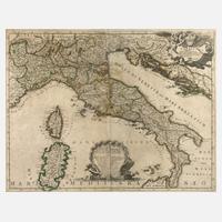 Darstellung von Italien mit Anrainergebieten, oben rechts figürliche Kartusche und hier bezeichnet "L`Italia... Sardegna Corse Corsica incisione carta mappa...", unten mittig weitere Kartusche mit Meilenzeiger, grenzkolorierter Kupferstich, Ende 17. Jh., mittig übliche Faltlinie, braunfleckig, hinter Glas gerahmt, Darstellungsmaße ca. 44 x 56 cm. Künstlerinfo: Giovanni Giacomo de Rossi, italienischer Kupferstecher und Verleger (1627 Rom bis 1691), Sohn des Giuseppe de Rossi, Quelle: Internet.