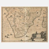 unten rechts figürliche Kartusche und hier bezeichnet "Aethiopia Inferior vel Exterior...", Darstellung der südlichen Hälfte von Afrika ca. ab Höhe Kongo Richtung Süden, im rechten Bereich Madagaskar (Karte stimmt nicht mit der Realität überein), weiterhin Einzeichnung diverser afrikanischer Wildtiere, Kupferstich, um 1670, mittig geglättete Faltlinie, gebräunt, unter Passepartout und hinter Glas gerahmt, Darstellungsmaße ca. 28 x 36,5 cm. Info: schottischer, Verleger, Kartograph und Übersetzer (1600 Kirriemuir/Schottland bis 1676 London), ab 1711 Schüler von John Draper, ab 1633 für Lord Deputy of Irland als Tanzlehrer tätig und Gründer des ersten Theaters von Irland, auch als Übersetzer der Werke von Vergil tätig, in London Übersetzung und Veröffentlichung von Homers Ilias, 1661 Verleihung des Titels „Master of the Royal Imprimerie“, Bauleitung für das neue Theater von Dublin, Mitorganisator des Wiederaufbaus von London nach dem großen Stadtbrand von 1666, viel beachtete Herausgabe von Atlanten zu Afrika, Amerika, China und Asien, 1671 Ernennung zum königlichen Kosmographen, 1675 Herausgabe seines bekanntesten Werkes „Britannia“, Quelle: Wikipedia.