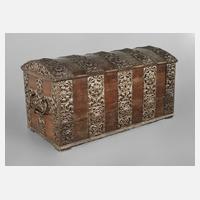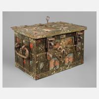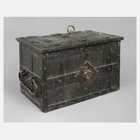 um 1700, Korpus komplett mit breiten Bändern beschlagen und vernietete Front mit imitiertem Schlüsselloch, im Deckel verstecktes Schlüsselloch, die Schlossplatte verziert mit durchbrochen gearbeitetem Rollwerk, Schloss mit vier Zuhaltungen, funktionstüchtig, originaler Schlüssel, Alters- und Gebrauchsspuren, Maße 33 x 51 x 30 cm.