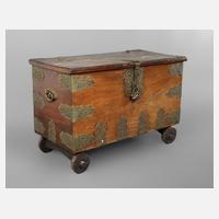 19. Jh., Korpus aus massivem Mahagoni gefertigt, allseitig mit fein ausgesägten Zierbeschlägen aus Messing verkleidet, Korpus auf Holzrollen gelagert, mit altem Vorhängeschloss, Oberfläche des Deckels mit Wasserschäden, alt restauriert, Maße 84 x 129 x 65 cm.