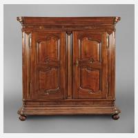 deutsch, Mitte 18. Jh., Nussbaum massiv, zerlegbarer zweitüriger Korpus mit abgeschrägten Ecken, Türen und Lisenen mit stark profilierten Kassettenfüllungen, alt restauriert, Schloss und einige Leisten ergänzt, stärkere Altersspuren, partiell inaktiver Anobienbefall, rest.bed., Maße 220 x 185 x 55 cm.