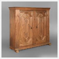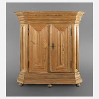 1. Hälfte 18. Jh., Eiche massiv, flacher zweitüriger Korpus, die Türen mit schönen Bastionsfüllungen und intarsiertem Sternmotiv, jeweils mit offenem Schloss, ein Schloss alt ergänzt, innen drei Regalböden, alt restauriert, Platte und Rückwand erneuert, Maße 155 x 169 x 45 cm.