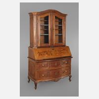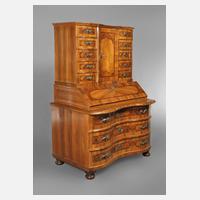 Mitte 18. Jh., Nussbaum massiv und auf Nadelholz furniert, Bandeinlegearbeiten in Zwetschge und Ahorn, dreiteiliger Korpus, das gedrungene dreischübige Kommodenunterteil mit zweifach gebauchter Front, mit originalen Beschlägen und Schlössern, darüber Schreibaufsatz mit Schrägklappe, innen mit Tapete und grünem Filz ausgeschlagen, der Aufsatz ebenfalls doppelt gebaucht mit zehn Schüben und einer Tür, innen nochmals zwei Schübe, alt restauriert, mit drei Schlüsseln, gering rest.bed., Maße 171 x 119 x 79 cm.