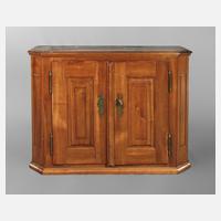 Mitte 18. Jh., Kirschbaum massiv, zweitüriger Unterschrank mit abgeschrägten Ecken, Messingbänder- und Beschläge, Schloss alt ergänzt, eine Leiste lose, Füße fehlen, stärkere Alters- und Gebrauchsspuren, restaurierungsbedürftig, Maße 102 x 134 x 47 cm.
