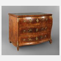 um 1765, Nussbaum auf Nadelholz furniert, elegant geschwungene dreischübige Kommode mit originalen vergoldeten Bronzebeschlägen und Schlössern, die Schübe innen mit originalem Kleisterpapier ausgeschlagen, Alters- und Gebrauchsspuren, Furnier teilweise mit Trocknungsrissen, rest.bed., Maße 82 x 110 x 60 cm.