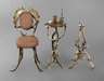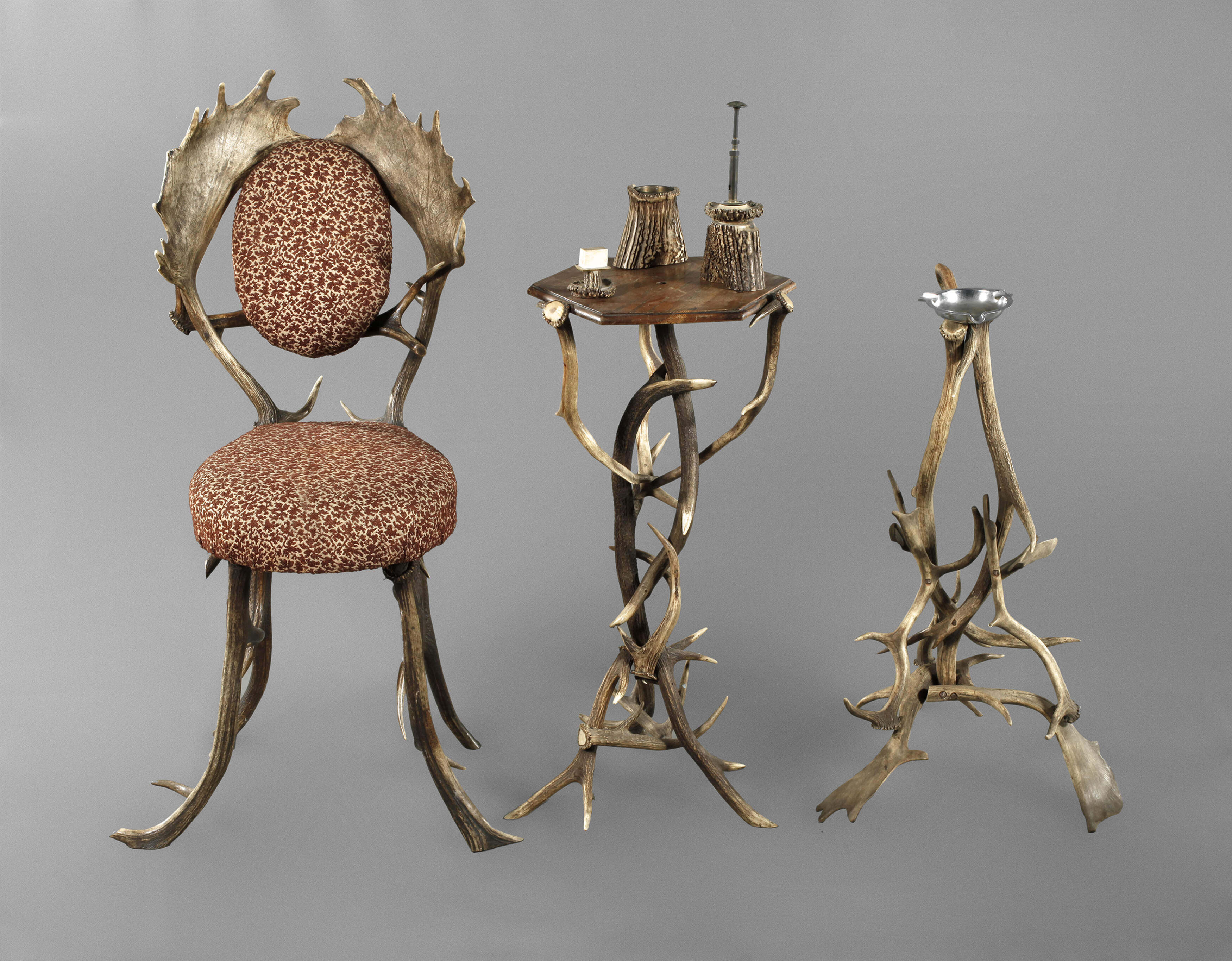 Anfang 20. Jh., bestehend aus Stuhl, Standascher und Rauchtisch, aus Rot- und Dammwildschaufeln gestaltete Kleinmöbel, der Stuhl mit gepolsterter Sitzfläche und Lehne, der Ascher mit Neusilbermontierung, der Tisch mit polygonal facettierter Rüsterplatte, fragmentarisch erhaltene Zigarrenschneider, Zigaretten- und Streichholzhalter, unterschiedliche Maße und Erhaltungen, H max. 100 cm.