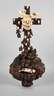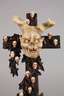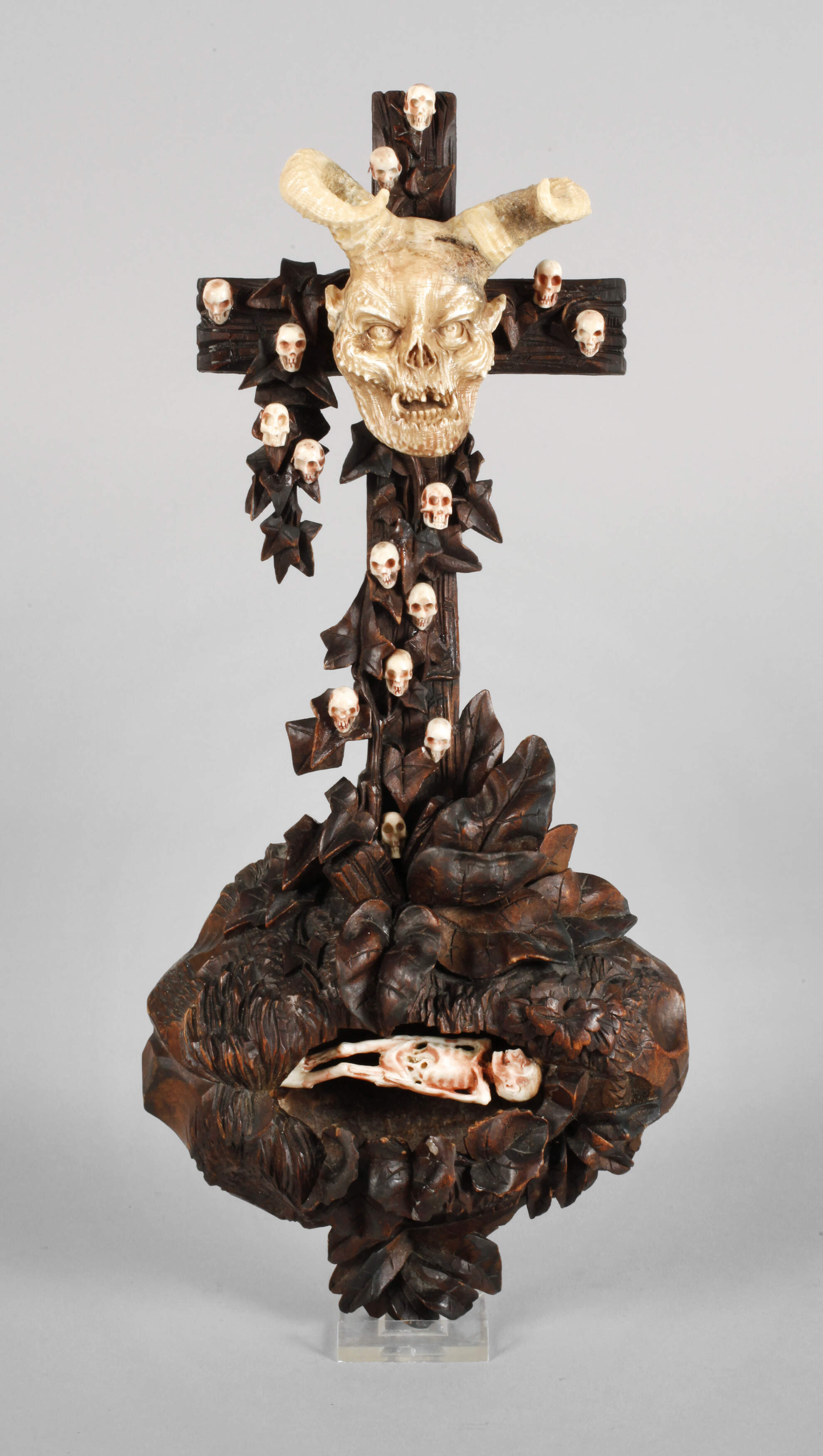 20. Jh., Laubholz beschnitzt, dunkel gefasst sowie Horn ebenfalls aufwendig bearbeitet, von Efeu umranktes Kruzifix, welches von etlichen Totenköpfen geziert wird und in dessen Zentrum ein Satanenhaupt prangt, im Bereich der Predella findet sich ein freigelegtes menschliches Skelett, gute Erhaltung, H 34 cm.