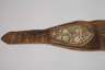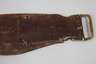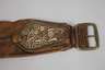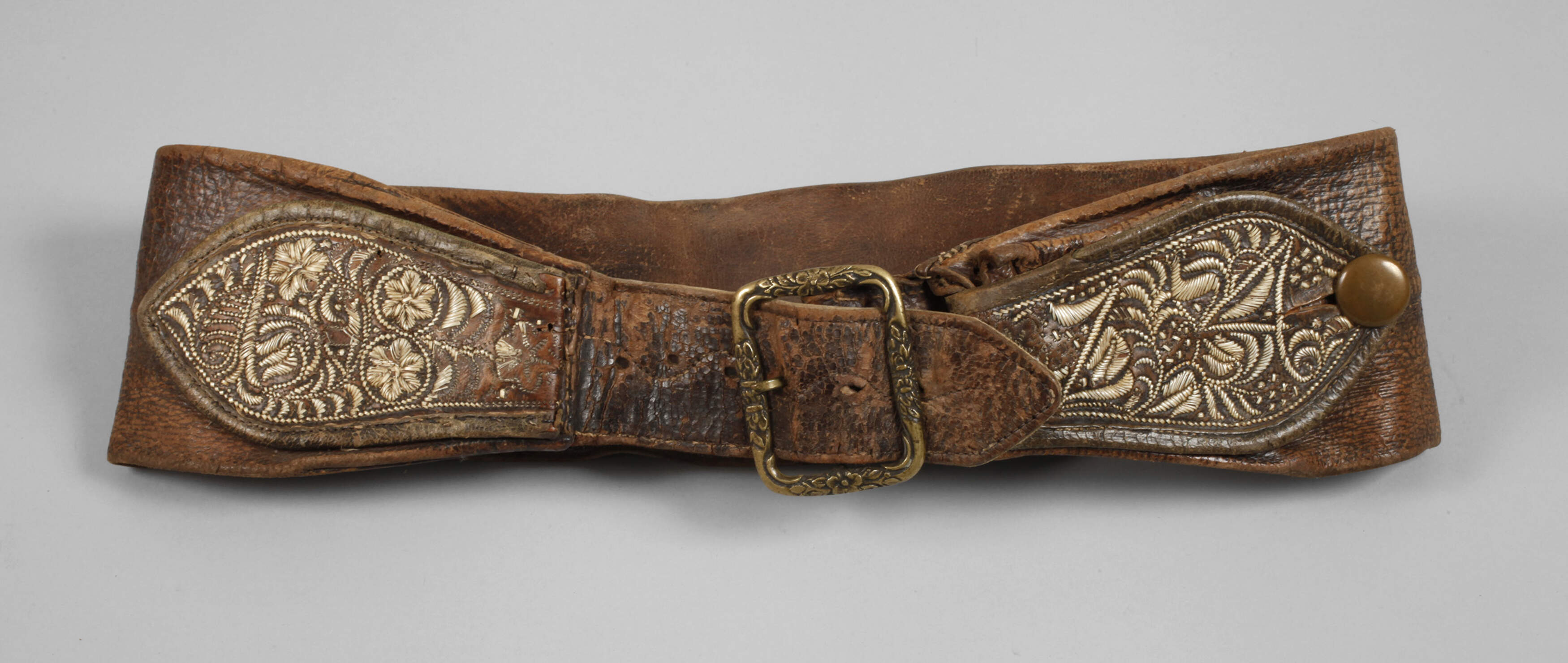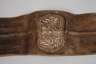 19. Jh., breites Modell aus dunkelbraunem Glattleder mit aufgelegten Kartuschen, deren florale und ornamentale Verzierungen aus Federkielen gefertigt sind, Schnalle aus Messing, Leder partiell etwas verschlissen, Altersspuren, L ges. 98 cm.