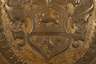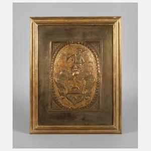 19. Jh., Messingblech getrieben, teils fein ziseliert und vergoldet, hochrechteckige Darstellung mit ovalem Medaillon, gerahmt von Lorbeerlaub, zentral platzierter Jägersmann mit Flinte über volutengeschmückter Wappentafel mit springendem Hund und Adler, flankiert von Rankwerk, berieben, Altersspuren, in vergoldeter Leiste gefasst, Maße 51 x 41 cm.