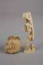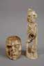 ungemarkt, wohl Hirschhorn beschnitzt, Januskopf, der einerseits einen bärtigen Mann und andererseits dessen sterbliche Überreste zeigt, dazu Tödlein als Standfigur, umwunden von einer Echse, leichte Altersspuren, H 4 und 8,5 cm.