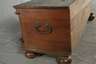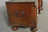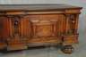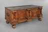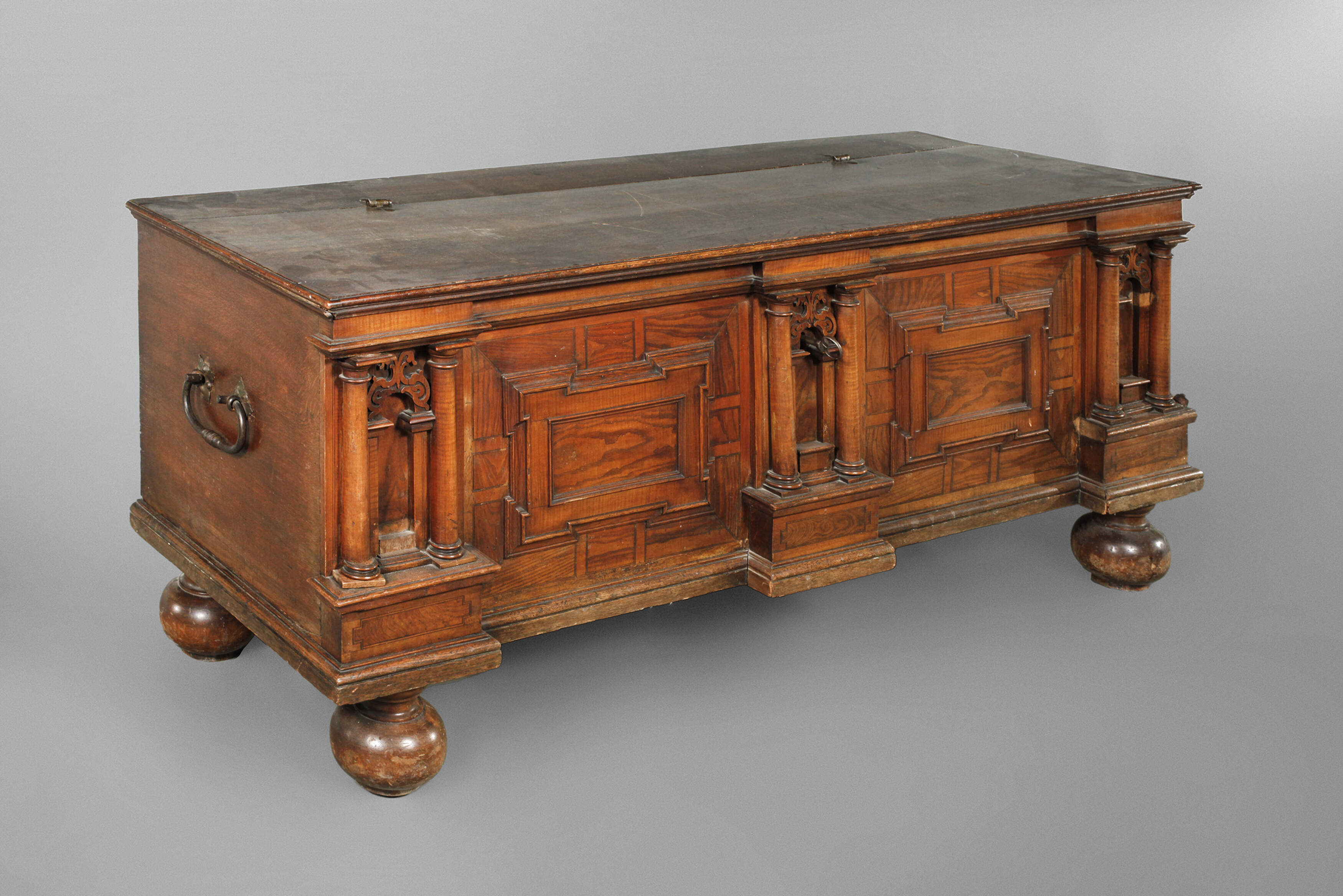 deutsch, um 1650, Eiche massiv und Rüster furniert, Fadeneinlage in Ahorn, fassadenartig gestaltete Front mit sechs Vollsäulen verziert, dazwischen aufgesetzte Bastionsfüllungen, originales Zangenschloss mit Schlüssel, gravierte Bänder, innen später mit Schichtholz verkleidet, kleinere Zierleisten fehlen, Alters- und Gebrauchsspuren, Maße 68 x 175 x 60 cm.