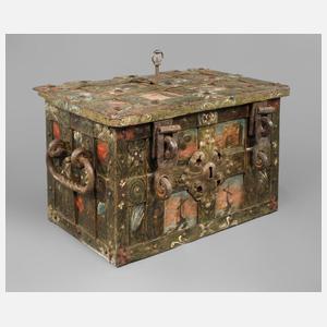 wohl norddeutsch, um 1700, allseitig mit breiten genieteten Eisenbändern beschlagen, originale Farbfassung mit Darstellung von Schiffen, Gebäuden, Bäumen und Blüten, Deckel mit zwei Riegeln für Vorhängeschloss, Front mit imitiertem Schlüsselloch, das Schlüsselloch im Deckel hinter einer Niete versteckt, Schloss mit fünf Zuhaltungen, die durchbrochen gearbeitete Schlossplatte mit graviertem Pferdemotiv, eine Schraube fehlt, funktionstüchtig, mit originalem Schlüssel, Alters- und Gebrauchsspuren, Maße 34 x 60 x 36 cm.