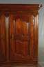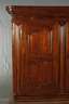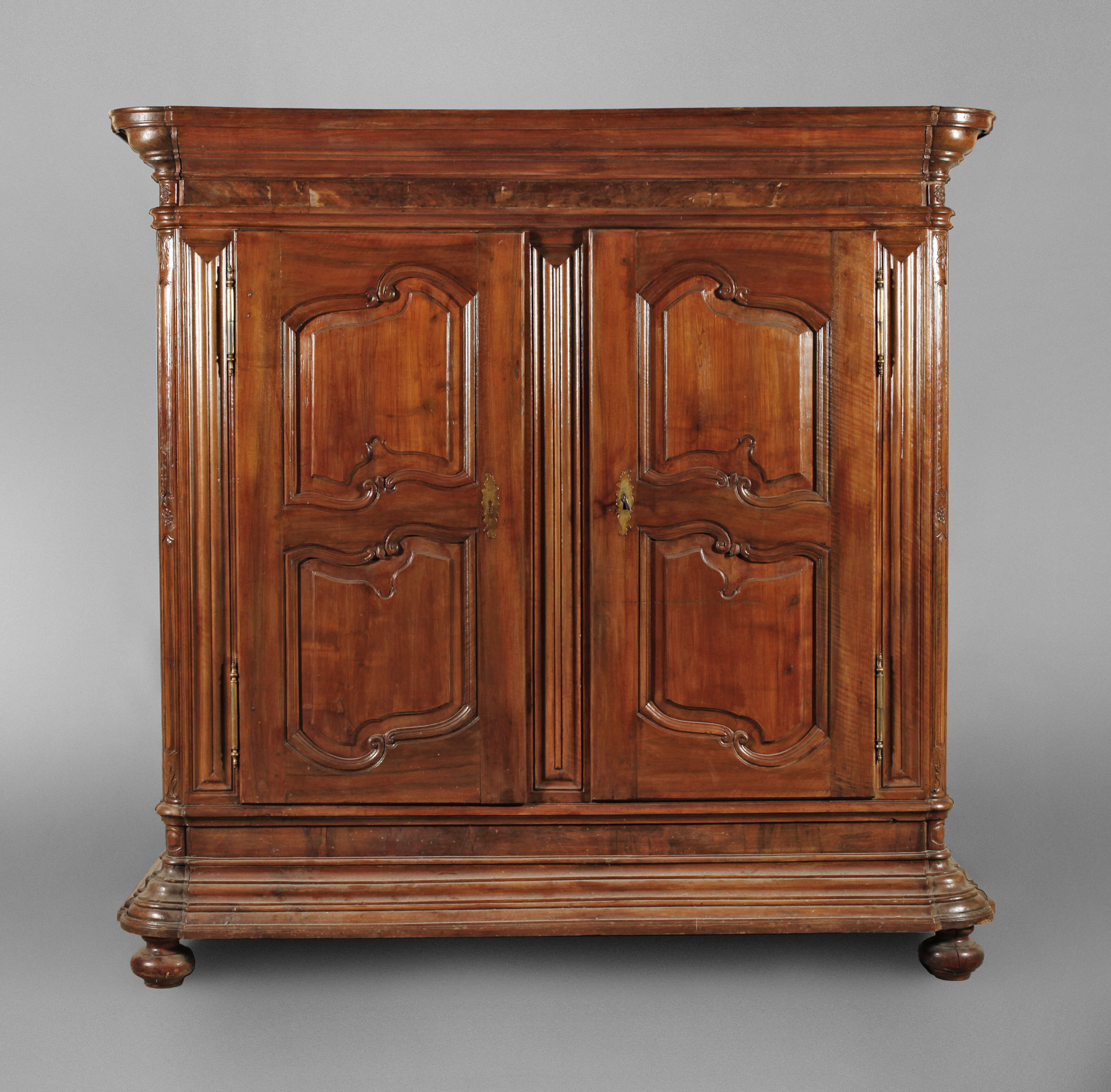 Nussbaum massiv und furniert, Mitte 18.Jh., großer zweitüriger, komplett zerlegbarer Kleiderschrank, mit fein geschnitzten Türfüllungen, die abgerundeten Ecken verziert mit geschnitzter Rosette und Palmettblatt, aufwendig getreppter Sockel und Profilgesims, originales Kastenschloss mit zwei Zuhaltungen und originalem Schlüssel, die linke Tür mit aufwendiger Verriegelung über Stangenschloss, später eingebaute Inneneinrichtung mit Regalböden, alt restauriert, Rückwand und die hinteren Füße locker, Sockel mit teils stärkeren Altersspuren, rest.bed., Maße 220 x 225 x 75 cm.