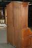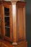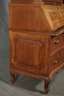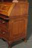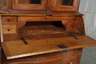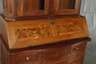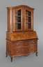 Mitte 18. Jh., Eiche massiv und Nussbaum auf Eiche furniert, zweiteiliger Korpus, zweischübiges Kommodenunterteil mit leicht gebauchter Front und Zentralverriegelung, Schübe und Seiten mit geschnitzten Rechteckfeldern, darüber Schrägklappe, Sekretär mit schlichter Inneneinrichtung, bestehend aus vier kleinen und einem breiten Schubkasten, darüber Vitrinenaufsatz mit vier unterschiedlich tiefen Einlegeböden, originales Messingschloss mit zwei Zuhaltungen, alt restauriert, ein originaler Schlüssel, Maße 201 x 121 x 64 cm.