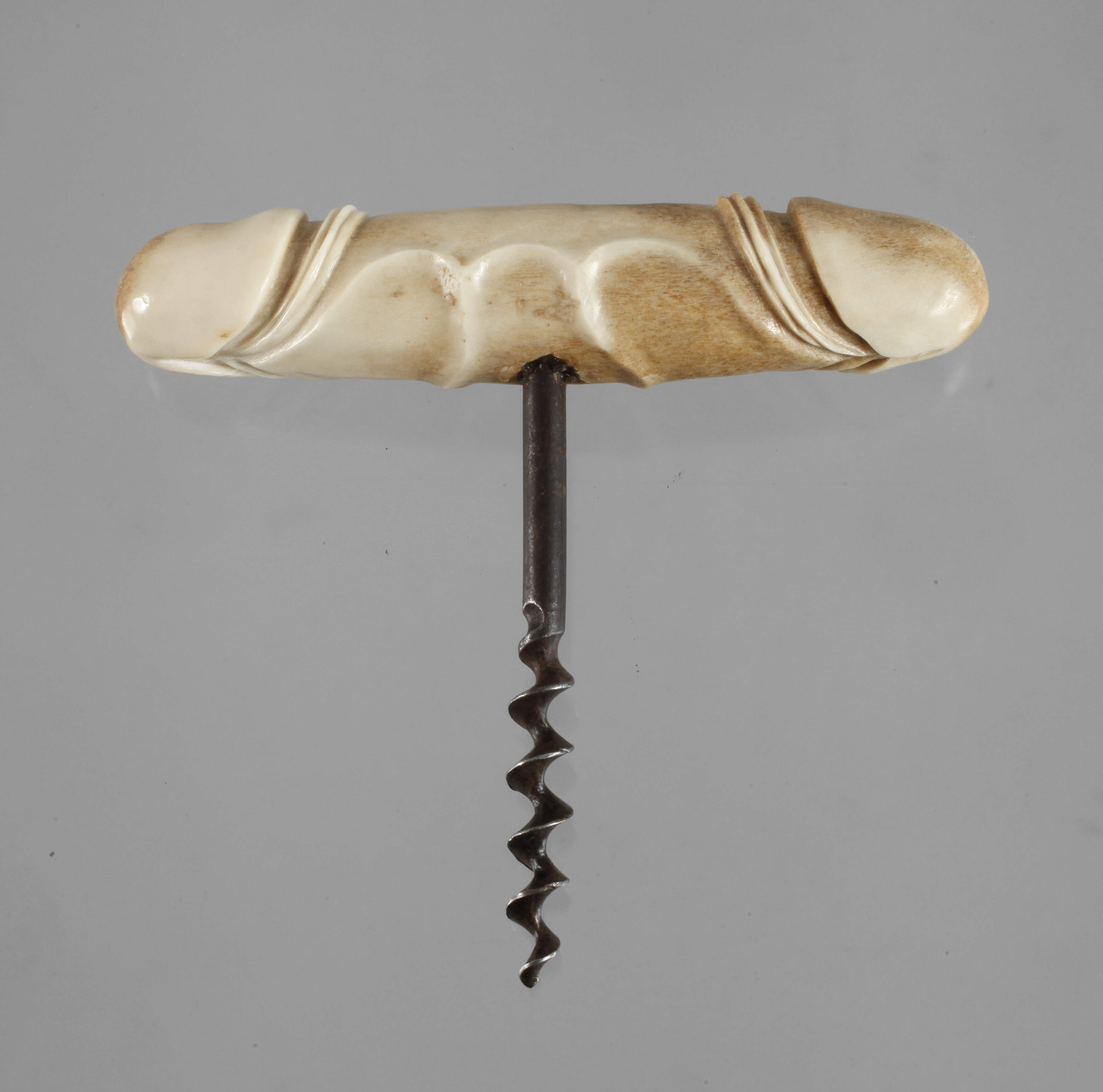 Anfang 20. Jh., Horn beschnitzt, Griffstück in Doppel-Phallus-Form, Montierung aus Eisen, Altersspuren, H 10 cm.