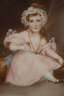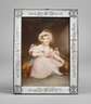Ganzfigurenbildnis eines auf einem Kissen sitzenden kleinen Mädchens im rosa Kleid mit Häubchen, eine Rose in der Hand haltend, feine miniaturhafte Malerei, Mischtechnik auf Platte, 1. Hälfte 20. Jh., rechts unten signiert "Maré" hinter gewölbtem Glas gerahmt, Falzmaße ca. 14 x 10 cm.