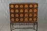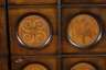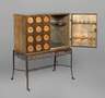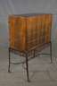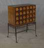 1950er Jahre, auf Rollen gelagertes schmiedeeisernes Gestell, darauf zweitüriger Schrank aus grünlich gebeiztem Buchenholz, die Türen mit brandschattierten Intarsien verziert, kreisrunde Floralelemente und Runen, innen mit schwarzem Glasboden und verspiegelter Rückwand, ein schmiedeeisernes Zierelement lose beigegeben, sonst guter Zustand, mit Schlüssel, Maße 94 x 71 x 35 cm.