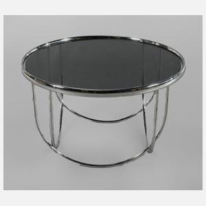Mitte 20. Jh., verchromtes Gestell mit vier halbkreisförmig gebogenen Beinen, eingelegte schwere Glasplatte aus grau getöntem Rauchglas, guter Originalzustand mit leichten Gebrauchsspuren, H 48 cm, D 77 cm.