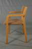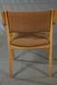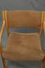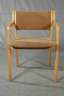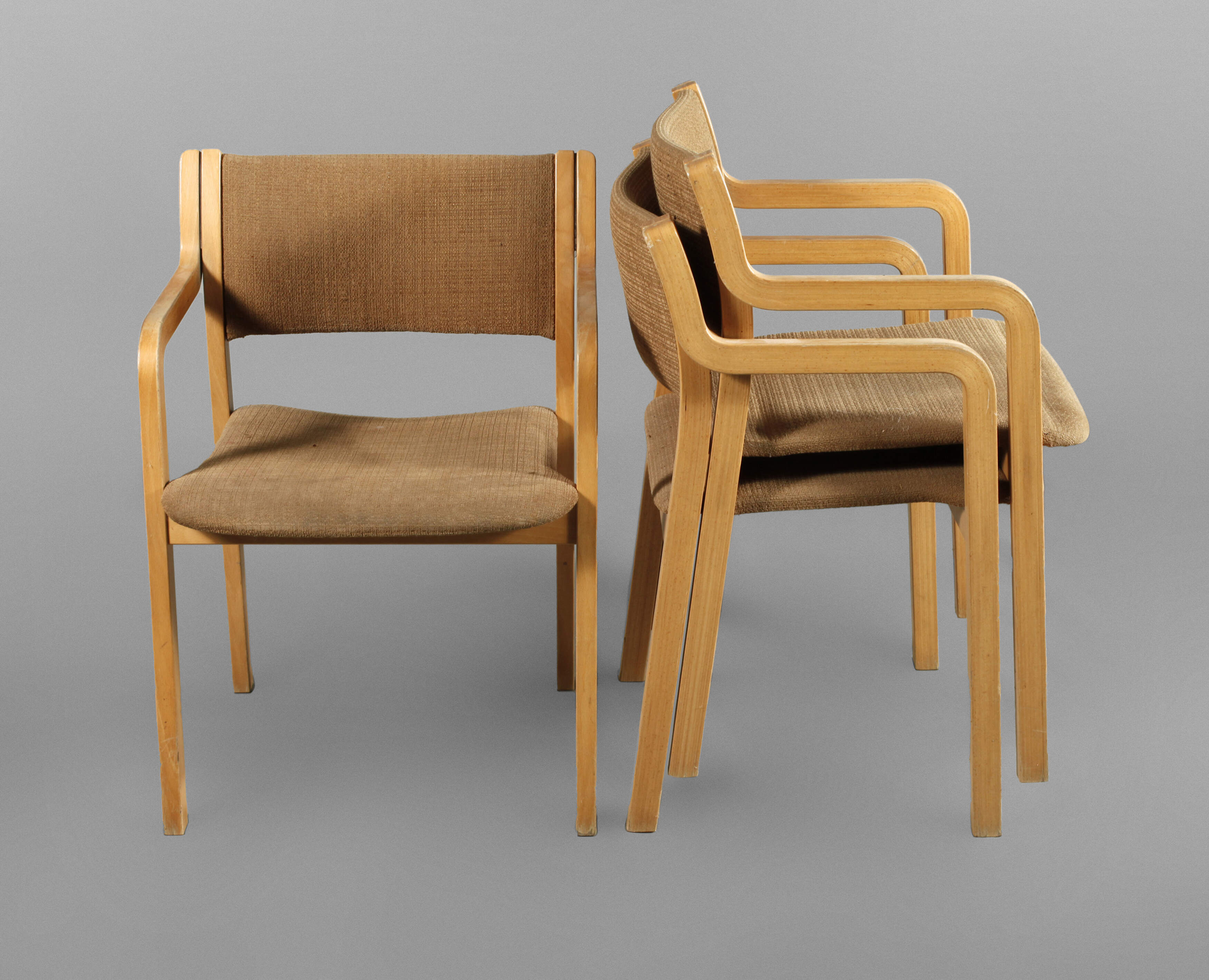 gemarkt EH-Furniture, H. Hartvig Olsen & Erik Simonsen Dänemark, 1960er Jahre, stapelbare, gepolsterte Stühle, Gestell aus Buchenschichtholz, originaler brauner Bezug, teils fleckig, Alters- und Gebrauchsspuren, Maße 78 x 55 x 47 cm.