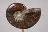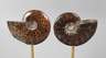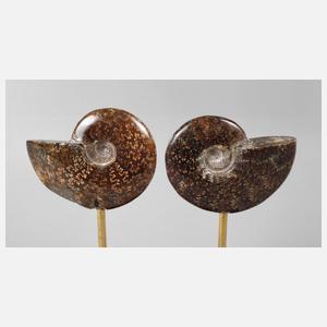 Fundort Marokko, geschliffene und polierte Ammoniten, jeweils auf Messingstab mit Holzsockel montiert, H ca. 20,5 cm, G ca. 600 g.