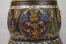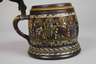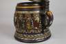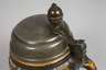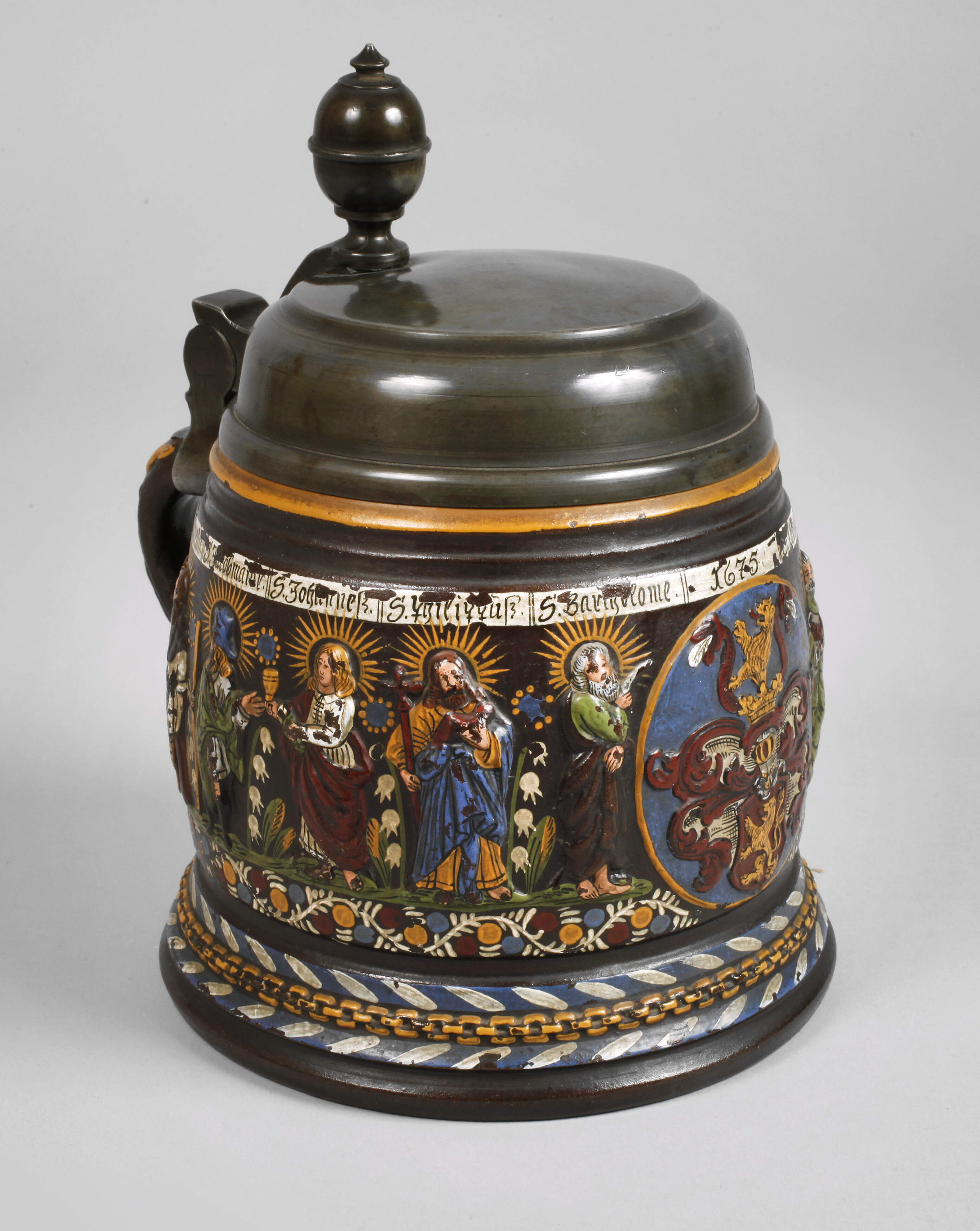wohl Ende 19. Jh., dunkelbrauner Scherben, braun glasiert und mit bunten Muffelfarben bemalt, datiert 1675, reliefierte Darstellung der zwölf Apostel, mittig Wappen mit Löwen, am Henkel Tierkopf, umlaufend Ornamentband und Gurtfurchen, Zinndeckel, partiell Farbfehlstellen, sonst unbeschädigter, guter Zustand, H 21,5 cm.