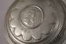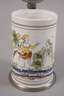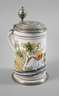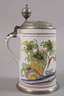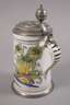 wohl Ende 19. Jh., ungemarkt, heller Fayencescherben, mit bunten Scharffeuerfarben bemalt, Darstellung zweier miteinander sprechender Frauen, seitlich Blumenmotive, Montierungen bestehend aus Zinnstandring und -deckel mit eingelegter Plakette Josephus II., graviertes Besitzermonogramm A.M.S., Deckel locker, etwas Alterscraquelé, H 25,5 cm.