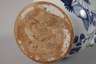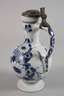 Ende 18. Jh., rötlicher Fayencescherben handabgedreht, unleserliche gepinselte Bezeichnungen, bläulich-weiße Glasur mit kobaltblauer floraler Bemalung, der Henkel mit Volutenmotiven verziert, Zinndeckel mit kurzem Drücker und spitzer Schnaupe, gewellter Henkelansatz, dort kleinere oberflächliche Fehlstellen, am Mündungsrand und Stand ebenfalls winzige Glasurfehlstellen, insgesamt guter altersgemäßer Zustand, H 28 cm.