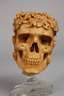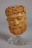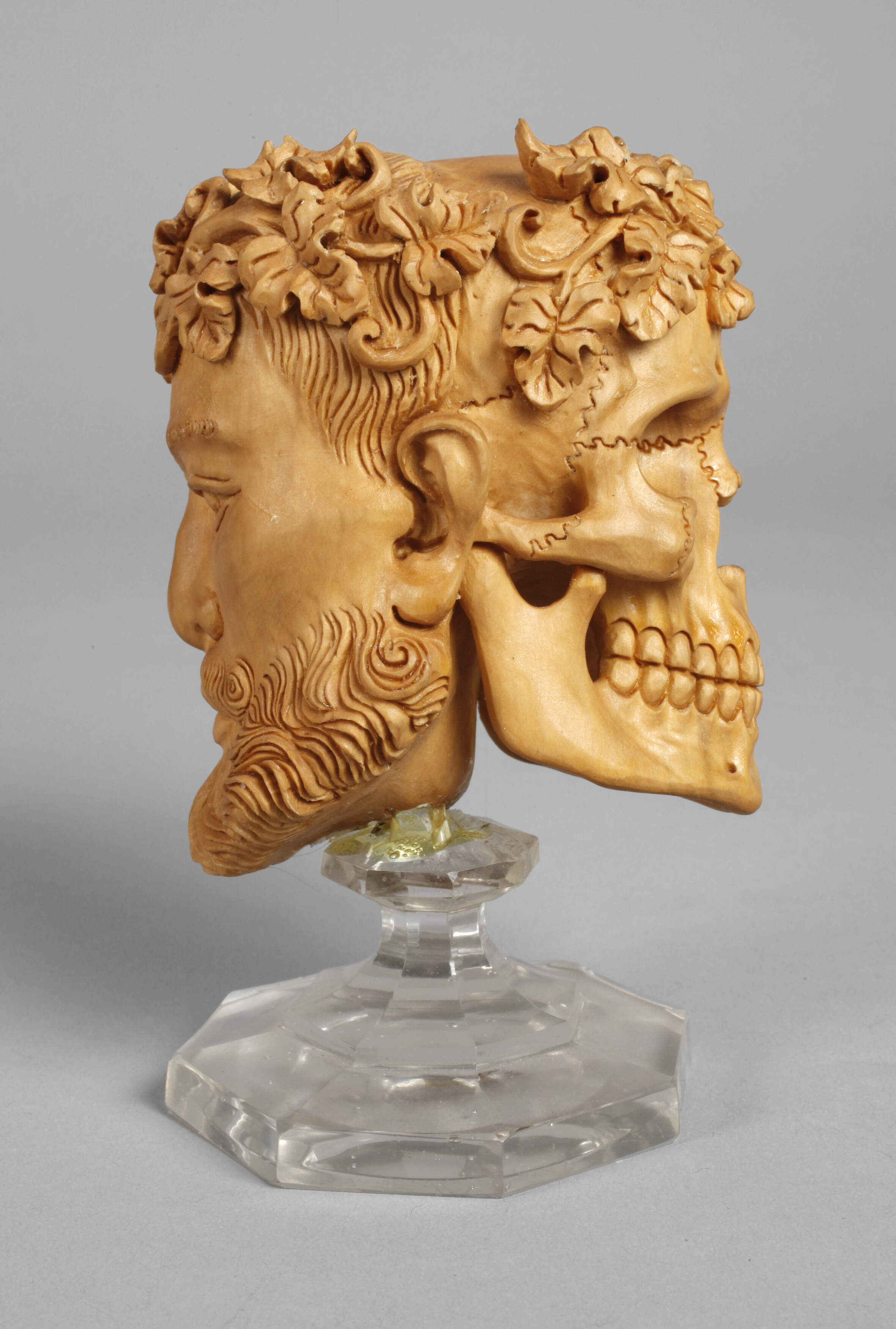 20. Jh., Laubholz aufwendig beschnitzt, vollplastische Darstellung eines Männerhauptes, frontseitig in der Blüte seines Lebens, auf der Kehrseite jedoch nur noch als Totenschädel, auf facettiertem Glassockel montiert, H ges. 12 cm.